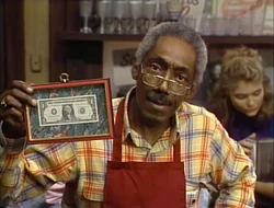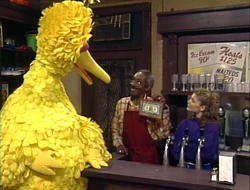 SCENE 2 | Mr. Handford tells Big Bird about how he made the framed, first dollar. He recalls his first day operating the store and sold some paperclips to Bert. He goes on to say that not only was it the first dollar he made at the store, but the first one he ever made as his own boss, reminiscing about his high school library job, then his career as a firefighter. Now that he's his own boss, he can pay himself and give himself orders (ordering himself to go buy some hamburger meat). |