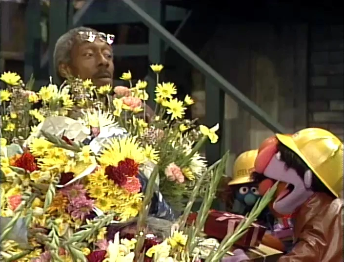SCENE 1 | Biff, Sully, and Stella bring dozens of flowers to Mr. Handford. Big Bird greets the viewer and reminds them of what happened yesterday when Hooper's Store came apart. Afterwards, the construction crew were in tears when initially prohibited from helping Maria and Luis fix the store, but Mr. Handford allows them, provided they are under careful scrutiny. Big Bird explains that because they were so happy, that's why they're giving him so many flowers (and boxes of candy). |