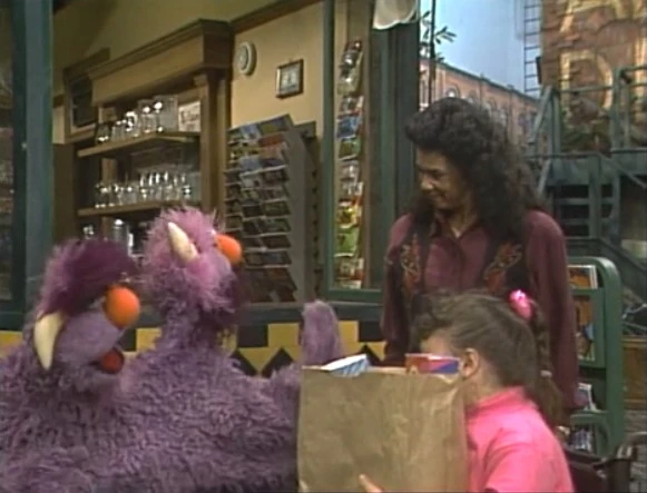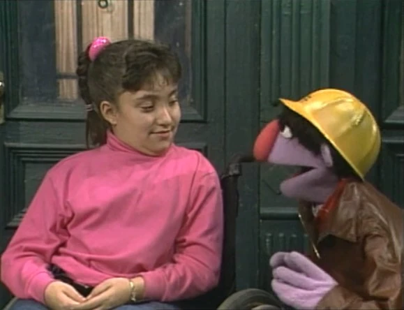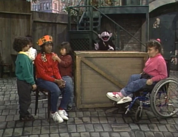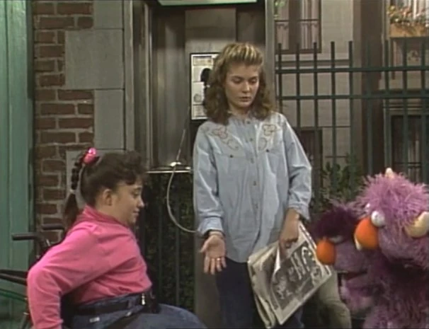 SCENE 1 | Gina introduces the Two-Headed Monster to Sheryl, a young girl who uses a wheelchair. The monster has never seen a wheelchair before, so Gina and Sheryl explain and demonstrate its use. Sheryl is unable to reach the pay phone, so they all cooperate to help her make a call. Gina inserts the coin, while the Two-Headed Monster dials the number. Sheryl's call is busy and she decides to call later, but the two heads begin to argue about who gets to hang up the phone. |