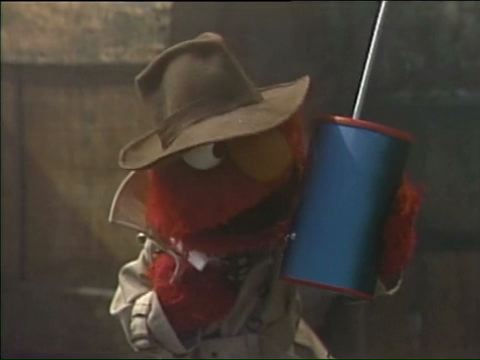SCENE 1 | Elmo and Zelda have been given some empty oatmeal boxes to play with from Gina. Luis helps them use the boxes as a secret telephone device. Elmo thinks they can imagine being secret agents, and pictures himself, Zelda, and Luis dressed in trenchcoats and fedoras on a foggy Sesame Street. They use their "phones" to communicate a secret message to each other from opposite sides of the street - the alphabet. |