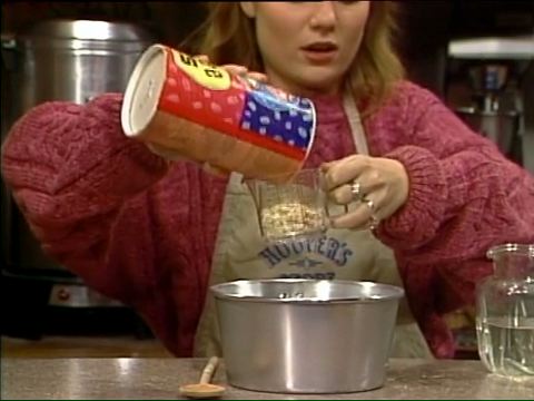 SCENE 3 | At Hooper's Store, Gina shows Luis, Zelda, and Elmo something else an oatmeal container can be used for - to make oatmeal. She assures Elmo that the dry, flaky contents from a full container will become oatmeal and starts to prepare some. Gina says it will take about 40 seconds to cook, so Elmo invites the viewer to count along... |