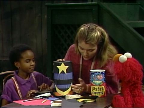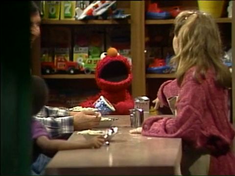SCENE 3 cont'd | Everyone enjoys the oatmeal, but Elmo prefers using the container as a drum. He keeps drumming (and singing "Babalu!") as Hoots announces the sponsors. |