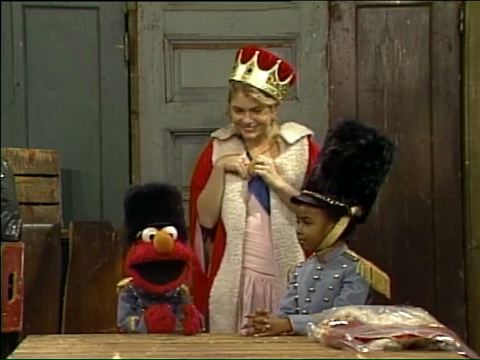SCENE 2 cont'd | In their imagination, the royal letter carrier and the royal dry cleaner arrive (both played by David Rudman), but neither know the password (βoatmealβ), so Elmo and Zelda take the Queen's goods on her behalf. Finally, the Queen (Gina, speaking with a Bronx accent) reveals that she has been behind them the whole time and promotes them to captains of the guard, rewarding them with oatmeal cookies. |