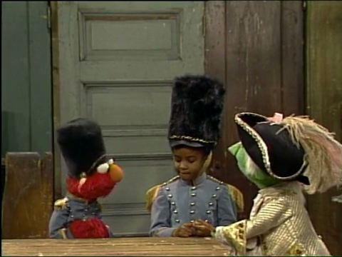SCENE 2 | Gina helps Elmo and Zelda turn the oatmeal boxes into hats. They remind Elmo of the kind of hats the royal guards wear when protecting the Queen, and they begin to imagine themselves as such... |