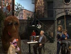 SCENE 1 | Gina, Uncle Wally, Snuffy, and the kids hang out in the yard when they're visited by Sonny Friendly with another one of his traveling game shows. This time, his game is "Sesame Street's Funniest Ideas." Snuffy imagines everyone wearing cabbages instead of hats and Sonny tries to get the camera crew to get a shot of Snuffy's idea. Gina tells them that ideas are inside one's head and can't be seen using cameras. Sonny realizes his game is futile and goes to think up another one. |