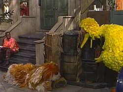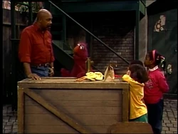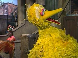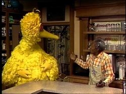 SCENE 3 | Big Bird prepares to talk about emotions at Hooper's Store with Mr. Handford's help, but Mr. Handford is involved in listening to the baseball game on his walkman. Big Bird instead points out Mr. Handford's emotions as the game progresses. |