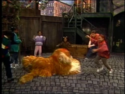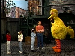 SCENE 1 | Big Bird wishes Luis, Mr. Handford, Mike, the kids, a couple of Honkers, Gordon, Lillian, and Barkley a good morning. He sings "Good Morning, Mr. Sun" afterward. |
