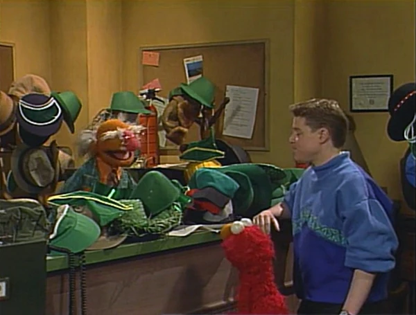 Mike and Elmo walk outside again to wait, and when they re-enter the office once again, there are plenty of hats to go around. Elmo specifies that he's looking for a green hat, but the man is so fed up with his mistakes that he decides to quit and storms out of his office. |