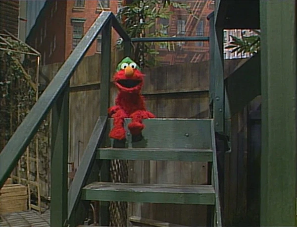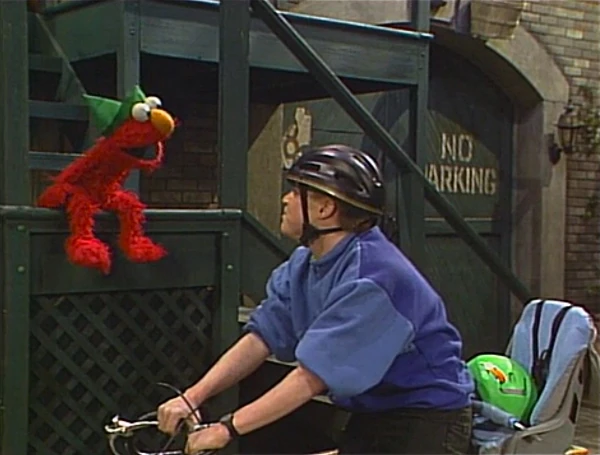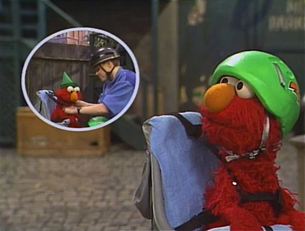 SCENE 2 | Mike brings Elmo back to the yard, where Elmo is about to put on his imagination hat - but he notices that it's missing! Elmo remembers Mike strapping him into the seat, him telling Elmo to take off the imagination hat, explaining why helmets are needed for bike riding, and tucking the imagination hat next to Elmo. Mike takes Elmo back to the park so they can look for it. |