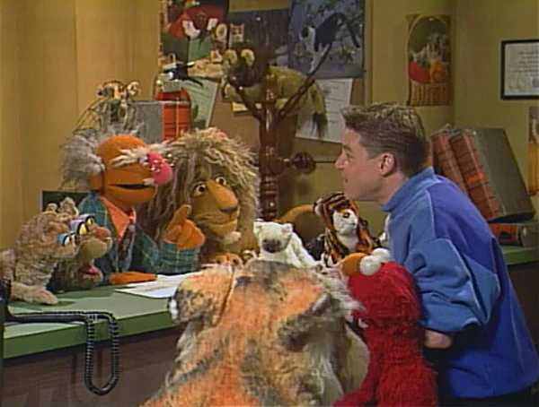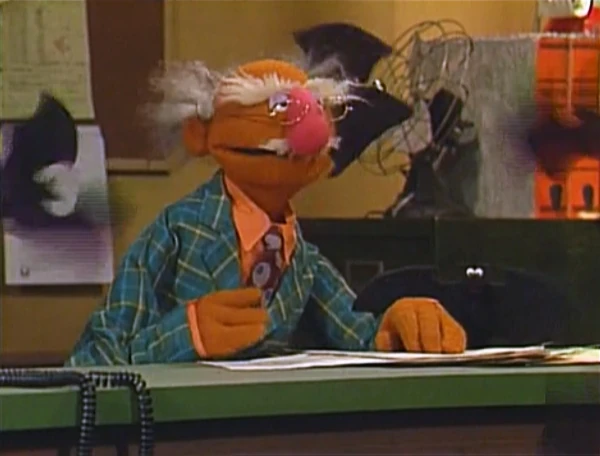 SCENE 4 | Elmo and Mike go downtown, where they find an office which reads "BUREAU OF LOST _ATS." They enter the office and find a lot of bats flying around. A man (Martin P. Robinson) sits at a desk, looking over some forms. Mike confirms that this is the Bureau of Lost Hats, but the man doesn't know the difference, since it's his first day on the job. He tells Mike and Elmo to wait outside while he makes some changes. |