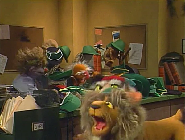 SCENE 5 | The bureau man, who decided not to quit after all, has filled the office with green hats to see if Elmo's imagination hat is among them. Mike reminds Elmo about the other features of his hat: it's also small, and pointy, has a feather, and has Elmo's name written inside it. The bureau man tries hard to find one that fits his description, but they don't find it. Mike and Elmo sadly leave the office, while the bureau man and his secretary (Pam Arciero) deal with the ensuing chaos from the hats, cats, and bats. |