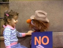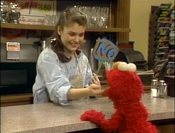 SCENE 1 | Gina discovers Oscar's discarded "NO" sign left in Hooper's Store from this morning and asks Elmo to bring it to his trash can. Elmo is eager to take on the task. |