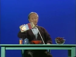 SCENE 2 cont'd | Next, Uncle Wally tries putting grapes in his cereal, but they bounce right out and roll of the table. He then tries pouring some milk, but it misses the cereal and pours onto the table instead. |