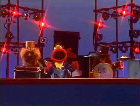 SCENE 5 | All the band's gear is set for the concert, when Elmo suggests they do a "game song" in the show. Elmo leads them in a doo-wop version of "Three of These Things" using their instruments and costumes, and Dayle and Andy guess that Elmo's suit is different than the guitar, piano, and drums. After the game, Elmo compliments the other singers and Mike for his pointing ability. |
