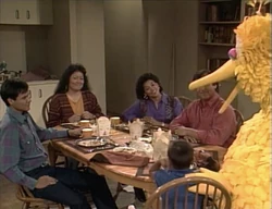 SCENE 4 | Luis has joined Big Bird and the Bear Claws at the dinner table, where Big Bird fills him in on all he's learned today. Lonn recalls how it was when he did his first Crow dance at the age of six, just like Francis. Big Bird muses about being able to see it, so Karen invites him to Montana. He's hesitant at first, as he has a playdate with Snuffy and a Birdketeer meeting, but Maria points out this will be a once in a lifetime opportunity. Maria and Luis are then invited to join them as well. Maria shares Big Bird's concern, since they have a lot of fixing to do, until Big Bird restates what Maria just told him. |