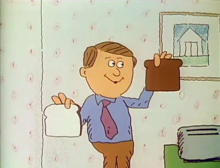 Cartoon | A man shows the difference between a regular slice of bread and a toasted one. (First: Episode 1497) |