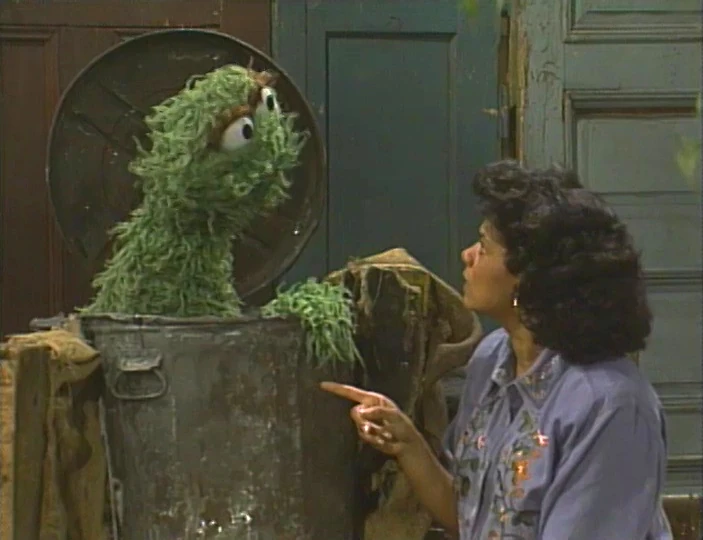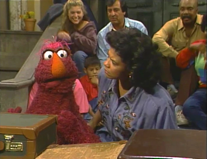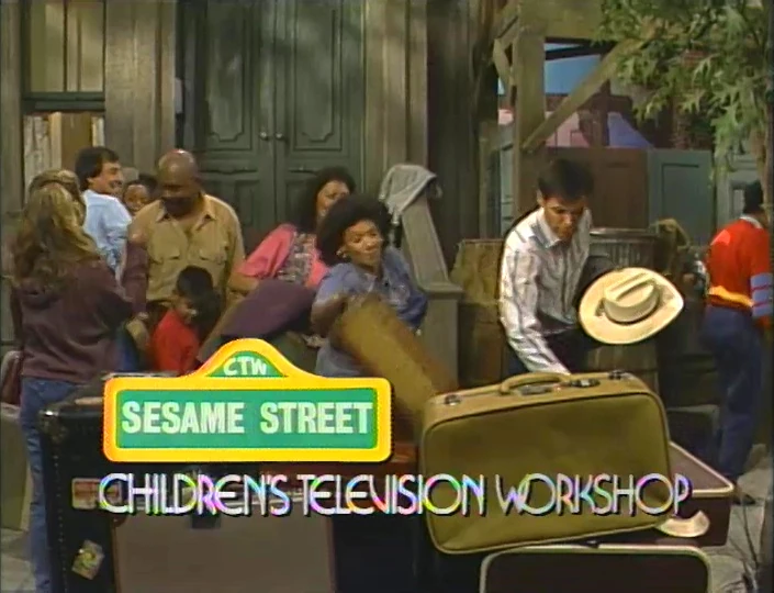 SCENE 6 | As the Count now counts scuff marks on the luggage, Oscar pops from his can wondering when all the nice people will be leaving. Telly then makes a shocking discovery - one of the suitcases doesn't have a name tag. Maria points it out and Telly is relieved and goes into another worried tangent, envisioning that the airport could possibly send the suitcase to the jungle by mistake, where it would get mangled by an alligator and fall down a waterfall. He ends on a happy note, saying that since the name tag is there, it can be sent safely back to Maria. Impressed by Telly's story, Oscar suddenly announces he's going to join them in Montana, asking to be put in with the luggage in the hopes he'll get lost. The taxi arrives and they begin to bring the luggage over. The Count is not finished counting yet... so he says he's joining them, too! As they gather the luggage, Snuffy announces the sponsors. |