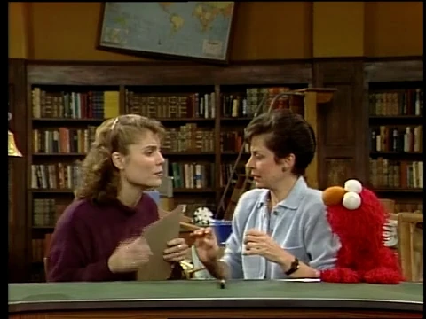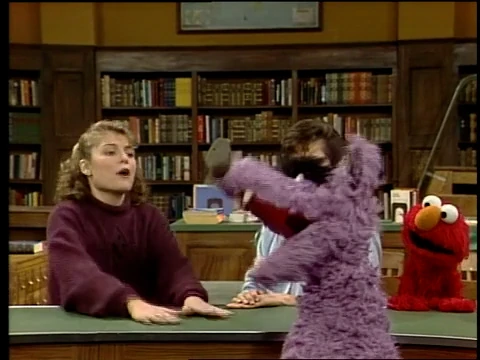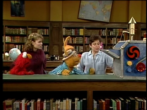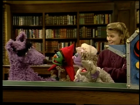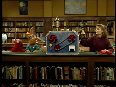 SCENE 1 | Preston Rabbit brings a present to the Sesame Street Library - an "Illustration Activation Machine," which brings to life the images in books. Gina and Elmo put a copy of "Little Red Riding Hood" into the slot on one side of the machine, and suddenly Little Red (speaking in a Valley accent) and the Big Bad Wolf are transported magically into the library! Elmo runs to get another book to try out. |