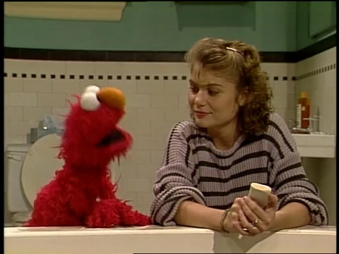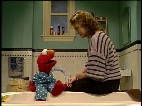 SCENE 1 | Gina welcomes the viewer while explaining that it's nighttime on Sesame Street, which means that it's almost time for the little kids to go to sleep. Tonight she happens to be babysitting Elmo, who rushes out as he's trying to avoid something he needs to do before bedtime. Gina reveals what it is by giving clues: it takes place in the bathroom, and involves a bar of soap, a towel, and a scrub brush. It's bath time! Elmo concedes and agrees to take one after getting his toy turtle... which he claims is in Cleveland. |