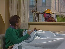 SCENE 1 | After pulling a late night, Bob sleeps on the couch until his first piano lesson of the day. His sleep is disturbed when Biff rises to the window on a scaffold (with Sully down below pulling the rope). The two have been hired by the landlord to do some repairs to the building, starting with replacing the cement surrounding the bricks. He promises applying the cement will be quiet, but scraping it off is quite loud. |