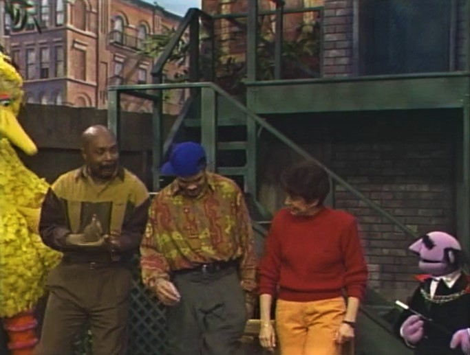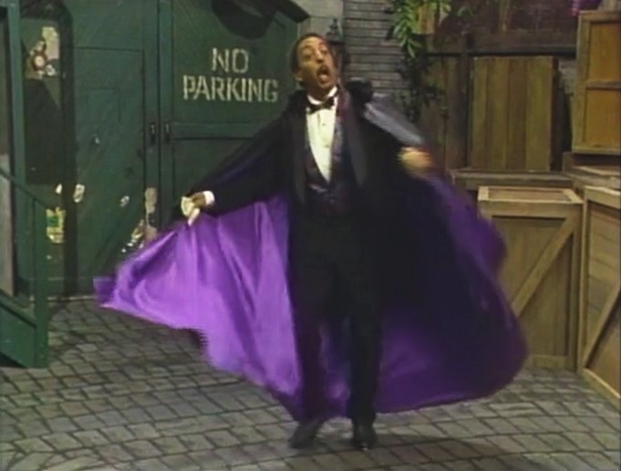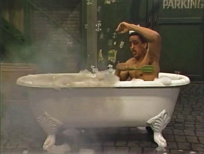 SCENE 2 | Everyone but Big Bird and the kids are starting to get tired of dancing, so Gina decides to call another magician on the phone. She finds someone called "Gregory the Great" in the phone book and Gordon summons him with the magic words: "A la sweet potato pie - house call!" Gregory the Great (Gregory Hines) appears... in the middle of his bath. He says he'll help as soon as someone gets him a towel. |