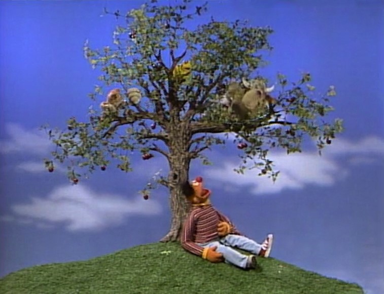 Muppets | Ernie sings "Quiet Time Song" while sitting under an apple tree, and is joined by a squirrel, a bird, a hornet's nest, a cat, and Gladys the Cow. (First: Episode 2091) |