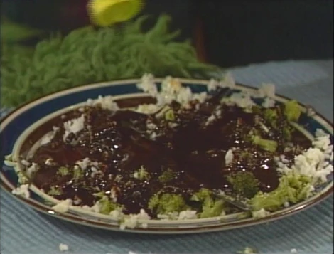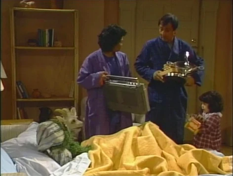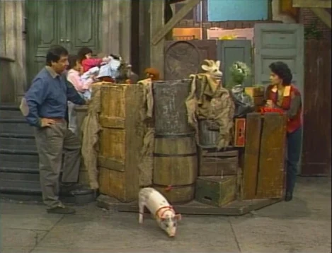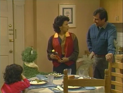 SCENE 2 | As Oscar's story continues, he and Lassie stay at Maria and Luis' apartment while the rest of the animals stay at Big Bird's nest (Lassie apparently tries to eat the nest, thus must stay with Oscar instead). The family presents Oscar with a healthful dinner, but he points out that a healthy Grouch meal mushes all the different foods together (plus some chocolate syrup, which he brings himself). While he digs into his entree, Lassie is fed some table napkins. Luis tries to comfort Maria with the notion that their guests will be gone tomorrow. |