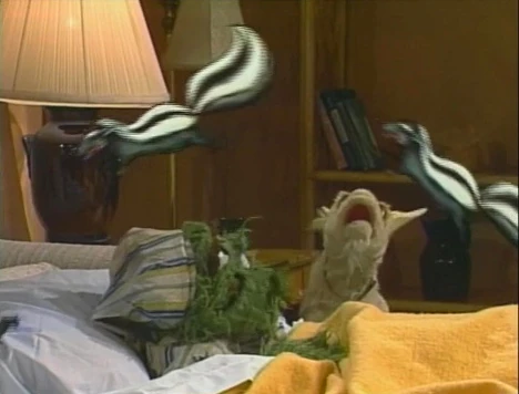 SCENE 3 | Big Bird has trouble getting the remainder of Oscar's pets (Slimey, Fluffy, Preposterous, Esme, Spot, and Jezabel) to be quiet and go to sleep. He proceeds to sing them "Let's Fall Asleep" (a spin on Cole Porter's "Let's Fall in Love"), which works in getting them all to sleep once the song ends. |