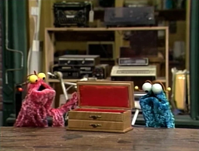 SCENE 1 | Maria finishes fixing Prairie Dawn's music box and goes into the Fix-It Shop to phone her. While she's gone, the Martians materialize and inspect the box, observing and imitating its melody ("Row, Row, Row Your Boat") whenever the box is opened. They enjoy the song and sing it as a round until Maria returns to take it inside. |