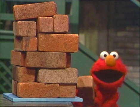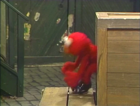 SCENE 3 | Elmo wonders if there's something he can learn that won't take years and years of practice like tap dancing or magic. He witnesses Herry Monster getting some exercise by moving a pile of bricks back and forth in the yard. Elmo thinks exercise won't take practice, but can't move the pile like Herry can. Elmo gets an idea and is able to move the bricks by taking them one at a time, still getting plenty of exercise. In fast-motion, he moves them from one table to the other, making himself dizzy in the process. |