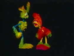 SCENE 3 | Big Bird approaches Gina and chooses her as a contestant on "Say the Word," hosted by Snuffy with a Sonny Friendly-esque quiz show host toupee. She has to say a secret word based on the clues she's given, but when she says "I would love to," the secret word - LOVE - is revealed on a banner as balloons and confetti are tossed, thus ruining the suspense of the game. Big Bird and Snuffy are disappointed that they didn't get to show her the clues before she said the word, but she asks to see them anyway. Behind the curtain are two lovey-dovey kissing ducks, which Gina wins as her prize even though she doesn't want them. |