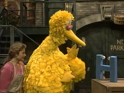 SCENE 3 | Gina finds Big Bird staring intently at a Muppet letter H (Martin P. Robinson), who stares back. Big Bird breaks out into laughter and explains to Gina that he's trying to get the H to laugh. Instead, he gets reminded of H words like "ha ha" and "ho ho" and can't help but laugh. Gina gives it a whirl and stares at the H until it breaks up laughing. "Never met an 'H' I couldn't make laugh," she says. |