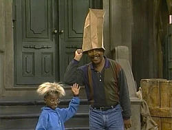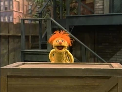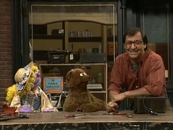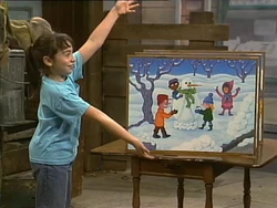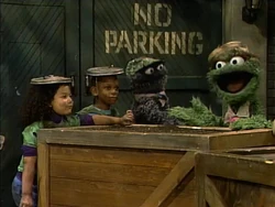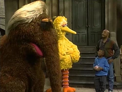 SCENE 1 | Gordon and Marcus are playing catch when Big Bird introduces the game show, "What Happens Next?" with host Mr. Snuffleupagus (wearing his quiz show host toupee). Gordon and Marcus wind up as contestants, where they must correctly guess what happens next in a series of pictures that Daria presents, which involves a group of kids' search of a hat for their snow-penguin sculpture. Gordon and Marcus give an obvious answer, which ends up being different than the one Big Bird and Snuffy have prepared: an older kid's grocery bag is used for the snow-penguin rather than her hat. Snuffy decides to give the contestants their prize anyway, which consists of a snow-penguin starter kit (a paper bag) and their very own quiz show host toupee! |