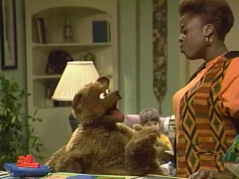SCENE 6 | Baby Bear has finally calmed down, and points out that he had a great time at day care today - especially since Goldilocks wasn't there, as Lillian correctly guesses. She suggests that because he talked about her all day long, perhaps Baby Bear may even like Goldilocks a little bit, which he emphatically denies. Baby Bear's anger returns, however, when Goldilocks shows up and informs him that Mama Bear had to go shopping and asked her to pick him up. Baby Bear is even more enraged to learn that Goldilocks was also invited to dinner, but Lillian reminds him of what to do when he feels angry. While Baby Bear starts counting to five over and over, Lillian announces the sponsors. |