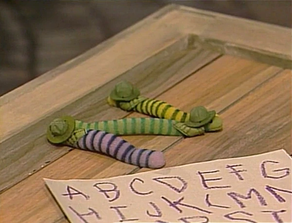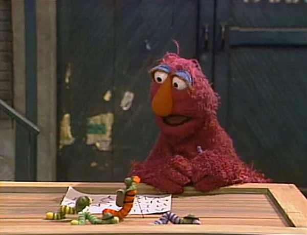 SCENE 2 | Telly has almost finished writing the alphabet and has forgotten what a Z looks like. The Worm Scouts arrive to help, but Telly wonders how they can help when they can't talk or hold a crayon. The worms end up forming a Z with their bodies and Telly thanks them for their service, telling the viewer, "You know, I feel safer just knowing that they're nearby." |