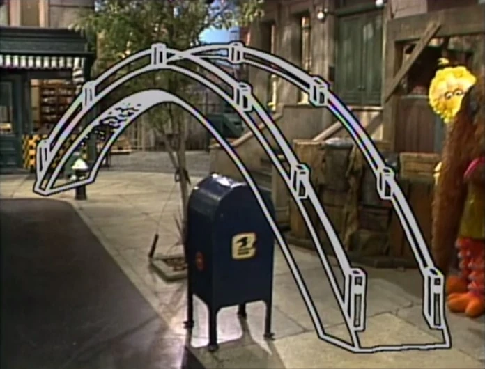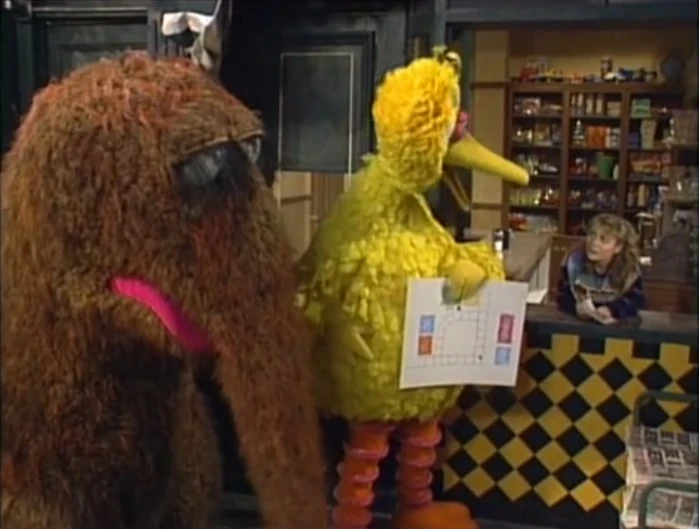 SCENE 5 | Big Bird and Snuffy need to stock up on birdseed and cabbage and intend to go to Hooper's Store for more. Big Bird realizes that he's promised to avoid Oscar's trash can, which is on the way to the store. They think they can jump over the can, then believe they can build a bridge. When those ideas falter, they put their heads together (CLUNK) and start brainstorming some more. |