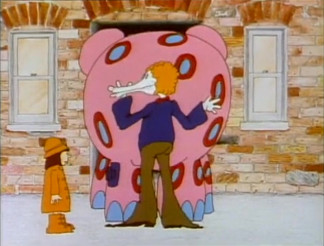 Cartoon | A man tries to push a huge balloon elephant through a narrow doorway, and a girl helps him by deflating it. (First: Episode 1824) |