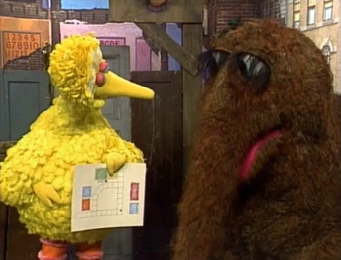 SCENE 6 | Big Bird has drawn up a map of the block. Using their imagination, they enter the map and sing a "Map Song" as they take the long way to get to Hooper's, avoiding Oscar's can entirely. |