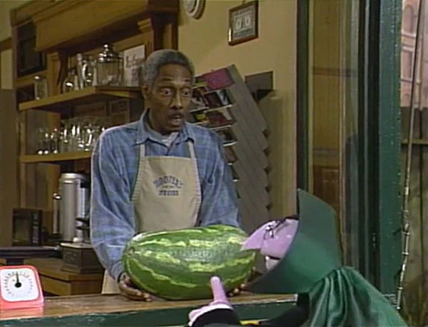 SCENE 4 | The Count has received a package from his Aunt Sasha, and is curious about what's inside. Mr. Handford opens the package and finds one watermelon. The Count isn't too thrilled about it - after all, it's only one watermelon, and his aunt usually sends him more things to count. Mr. Handford assumes she sent it to him so he could count how many pounds it weighs. He retrieves his scale, and finds that the watermelon weighs 10 pounds (which the Count happily counts). The Count then discovers something else to enumerate: how many times he falls over when Mr. Handford hands him the watermelon. |