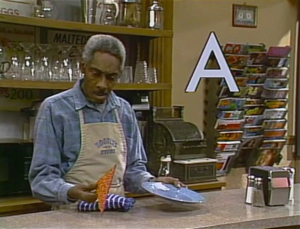 SCENE 6 | Maria comes in to Hooper's Store for lunch and asks for a slice of pizza. Suddenly, Sonny Friendly, host of "The Triangle Game," barges in with another travelling game show and makes Maria his unwilling contestant, telling her to look for something that's shaped like a triangle. She tells him off as usual, but he notices her triangular-shaped lunch and crowns her the winner of his triangle. By "mistake," he leaves with Maria's pizza and she chases after him. The Count announces the sponsors. |