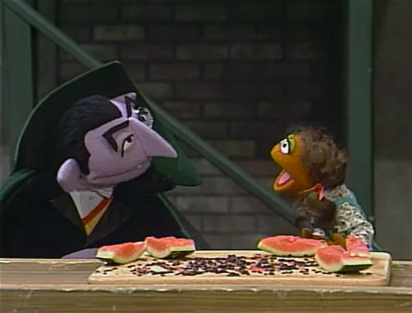 SCENE 5 | The Count tells Mr. Handford about another use he found for his watermelon: earlier, he grew bored counting his watermelon so he decided to give it to a hungry little girl (Fran Brill). She came back, having finished the watermelon, and brought him back the many seeds to count! He reflects on what he learned: "Sometimes, when you give something away, you get something back that is even better." |