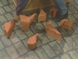 SCENE 5 | Telly now drags in a giant number 7 to help talk about it, but accidentally drops it onto the ground, shattering it. Telly relays his woes to Gordon, who points out that the broken 7 can still help - it's now in 7 different pieces. |