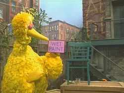 SCENE 3 | Big Bird finishes painting a chair while Slimey watches. He has a "WET PAINT" sign handy so nobody ruins the paint. However, he can't find a place to put it; if it goes on the chair, it could ruin the paint. Slimey has an idea and fetches his airplane, circling the area while waving a "WET PAINT" flag behind him. |