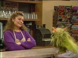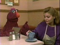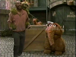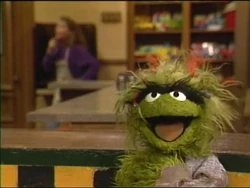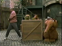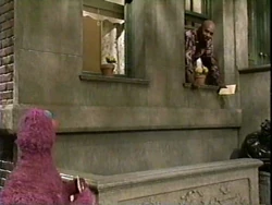 SCENE 3 | Gordon, waiting for an important phone call at his apartment, asks Telly out the window to get him some things from Hooper's Store. Telly runs off to the store before Gordon can give him the list, but Telly comes back with paper and pencil so he can write down what Gordon wants. Gordon tells him he could've just asked for paper and a pencil from him instead of from the store, so Telly decides to return the pencil and paper he just got. |