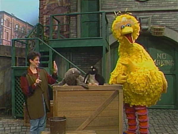 SCENE 3 | Big Bird and Linda are going to be showing βsameβ and βdifferentβ using Wolfgang and a penguin (Peter Linz). Since no bananas are being used, Davey and Joey duck out. Big Bird explains the difference between the two animals, while Linda shows what they have in common: their interest in fish. Big Bird remarks, βI think Linda got the easy part.β |