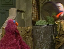 SCENE 1 | Humpty Dumpty, having been fixed and covered in bandages, decides to sit on a trash can instead of a wall, thinking he'll be safer if he does. He comes up with a new rhyme for his seating arrangement, but Telly tries to warn him that he's sitting on Oscar's trash can, which is not a safe place to sit. Oscar opens the lid to see what the hubbub is, and Humpty Dumpty flies off and shatters. All the king's horses and men come to sweep up the pieces and take him back to the Fix-it Shop. |