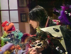 UK Spot: A candle moves across Kermit's desk. Some masked beings begin appearing around Kermit until he runs off. The monsters un-mask themselves and sing "Once a Year Day." |
