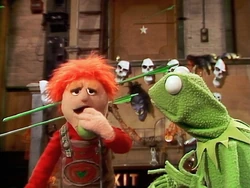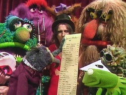 During Kermit's introduction, he explains tonight will be a creepier show than usual because of their guest. Suddenly, the lights dim and eerie noises go off. Kermit makes a hasty intro and exit. |