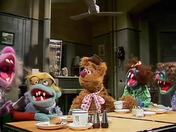 Fozzie can't take the creepiness going on upstairs and prefers staying in the canteen with the "clean-cut kids", who are anything but. Fozzie sighs and hopes for something nice on the show tonight. |