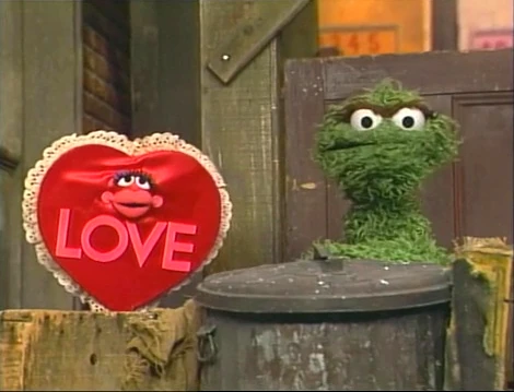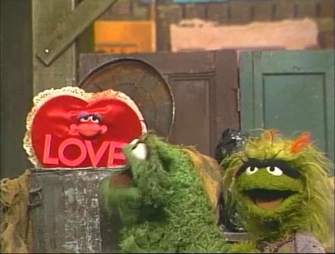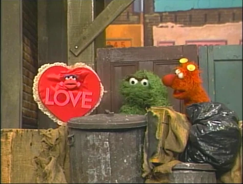 COLD OPEN | Grundgetta rushes up to Oscar and warns that LOVE is coming. As a pastiche of "Love Is a Many-Splendored Thing" plays, a sentient heart with the word LOVE on it appears and coos, "Love..." Oscar takes shelter in his can, while Grundgetta warns the word to stay away from her Grouch. |